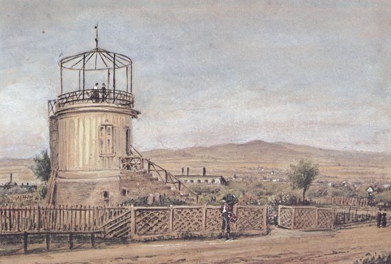 ↑ Aussichtstempelchen im Engelbach-Bansa’schen Garten auf dem Mühlberg in Frankfurt-Sachsenhausen, am Hühnerweg 30, in reduzierter Höhe als Goethe-Tempel erhalten; Aquarell von Eugen Peipers, datiert um 1870, Historisches Museum Frankfurt; Quelle: Michael Engelbach, https://engelbach-wwr.de/